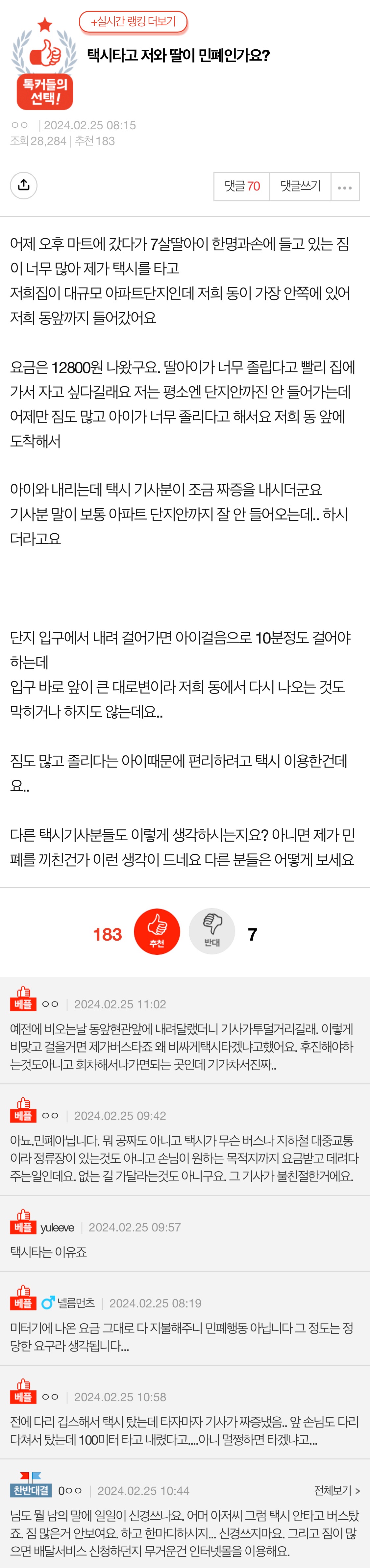 택시타고 저와 딸이 민폐인가요? 댓글 0 조회 500 5시간전 작성자 : 네이마르로 좋아요 팔로우 게시글 보기 네이마르로님의 최신 글 10.16 치마를 입으면 더욱 아찔해 지는 계단 10.16 중국인 관광객 조건부 한국내 운전 허용 검토 10.16 진주남강유등축제 닭강정 1만원 어치 10.16 싱글벙글 애플 직원할인 받기 10.16 승률 100% 트럼프 내부자 계좌 근황 10.16 갓 오브 워 팬들끼리 은근히 갈리는 주제 10.16 시간 정지 능력의 패널티 수준 10.16 초코 케이크로 만드는 미국식 초코쉐이크 10.16 회사에서 ㅈ될 뻔한 블붕이 10.16 남자에게 40대가 된 다는 것은