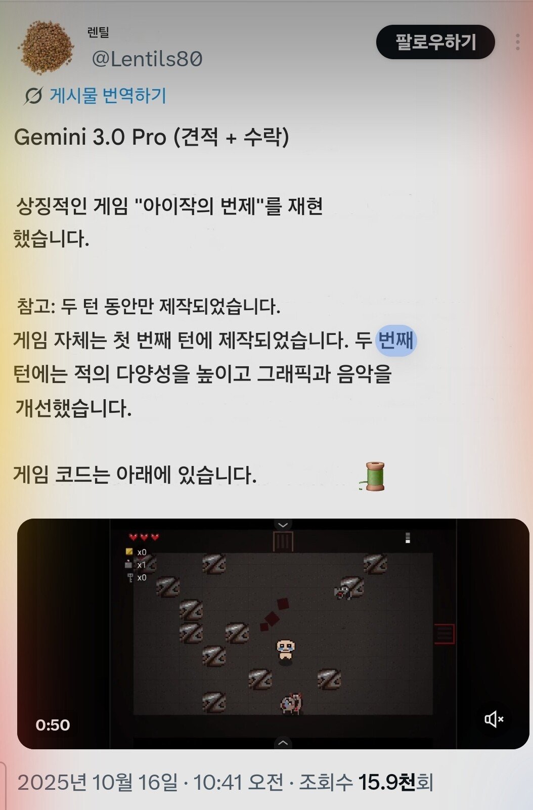 곧 출시되는 구글 Gemini 3.0으로 만들었다는 게임 댓글 0 조회 570 10.17 08:27 작성자 : 가지마라 좋아요 팔로우 게시글 보기 예..? 게임엔진 X HTML로 만들었다함 가지마라님의 최신 글 10.18 세월호의 최후 (feat. 잘 사용하고 갑니다) 10.18 탈북자, "남한은 번역 수준이 낮다" 10.18 진짜 맛잘알들이 먹는 탕수육 소스 10.18 40대 이하는 TV를 거의 안봄 10.18 이번 이슈로 연예계에 현타느끼는 사람들 10.18 한국어 "사이시옷" 폐지한다는 말에 반대하는 사람들 10.18 근데 트위터 애들 왤케 월 2~300 무시하지 10.18 살면서 부산에 처음 간 어느 운전자 10.18 20대의 시선으로 본 가난한 사람 특징 10.18 20년내 없어질 가능성 높은 직업 순위