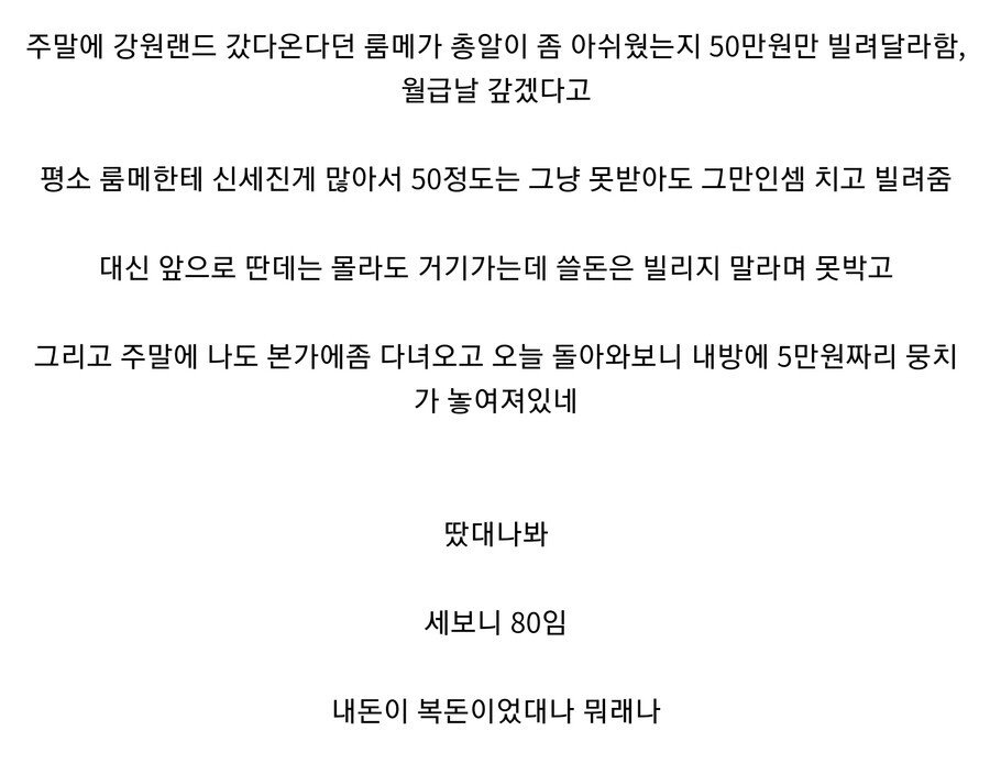 강원랜드 간다는 룸메한테 돈 빌려준 사람 댓글 0 조회 516 10.17 08:16 작성자 : 드가쥬아 좋아요 팔로우 게시글 보기 드가쥬아님의 최신 글 10.18 세월호의 최후 (feat. 잘 사용하고 갑니다) 10.18 탈북자, "남한은 번역 수준이 낮다" 10.18 진짜 맛잘알들이 먹는 탕수육 소스 10.18 40대 이하는 TV를 거의 안봄 10.18 이번 이슈로 연예계에 현타느끼는 사람들 10.18 한국어 "사이시옷" 폐지한다는 말에 반대하는 사람들 10.18 근데 트위터 애들 왤케 월 2~300 무시하지 10.18 살면서 부산에 처음 간 어느 운전자 10.18 20대의 시선으로 본 가난한 사람 특징 10.18 20년내 없어질 가능성 높은 직업 순위