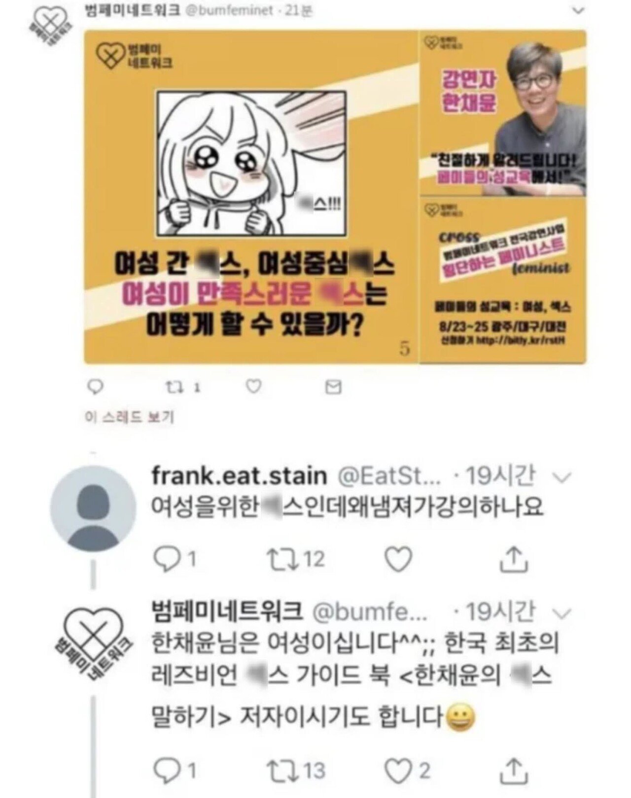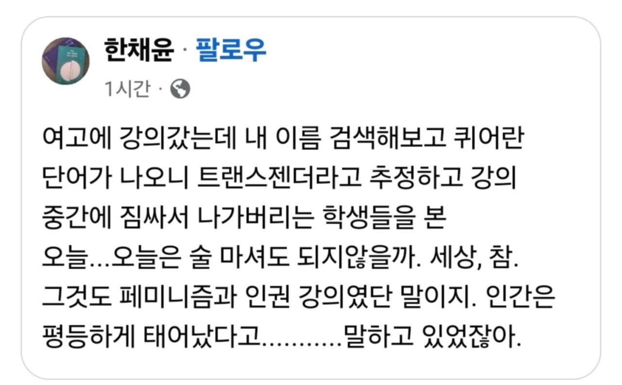 여고에 페미니즘 강의 갔다가 트젠으로 몰려서 현타온 강사 댓글 0 조회 583 10.17 08:14 작성자 : 더한마음 좋아요 팔로우 게시글 보기 더한마음님의 최신 글 10.18 세월호의 최후 (feat. 잘 사용하고 갑니다) 10.18 탈북자, "남한은 번역 수준이 낮다" 10.18 진짜 맛잘알들이 먹는 탕수육 소스 10.18 40대 이하는 TV를 거의 안봄 10.18 이번 이슈로 연예계에 현타느끼는 사람들 10.18 한국어 "사이시옷" 폐지한다는 말에 반대하는 사람들 10.18 근데 트위터 애들 왤케 월 2~300 무시하지 10.18 살면서 부산에 처음 간 어느 운전자 10.18 20대의 시선으로 본 가난한 사람 특징 10.18 20년내 없어질 가능성 높은 직업 순위