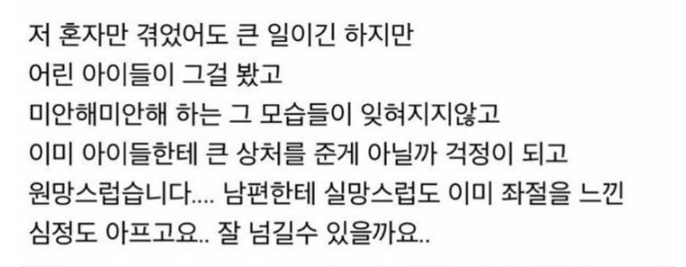 남편에게 어퍼컷을 맞아 눈물이 난 유부녀 댓글 0 조회 554 10.17 08:11 작성자 : 가비슈포댄서 좋아요 팔로우 게시글 보기 가비슈포댄서님의 최신 글 10.18 세월호의 최후 (feat. 잘 사용하고 갑니다) 10.18 탈북자, "남한은 번역 수준이 낮다" 10.18 진짜 맛잘알들이 먹는 탕수육 소스 10.18 40대 이하는 TV를 거의 안봄 10.18 이번 이슈로 연예계에 현타느끼는 사람들 10.18 한국어 "사이시옷" 폐지한다는 말에 반대하는 사람들 10.18 근데 트위터 애들 왤케 월 2~300 무시하지 10.18 살면서 부산에 처음 간 어느 운전자 10.18 20대의 시선으로 본 가난한 사람 특징 10.18 20년내 없어질 가능성 높은 직업 순위