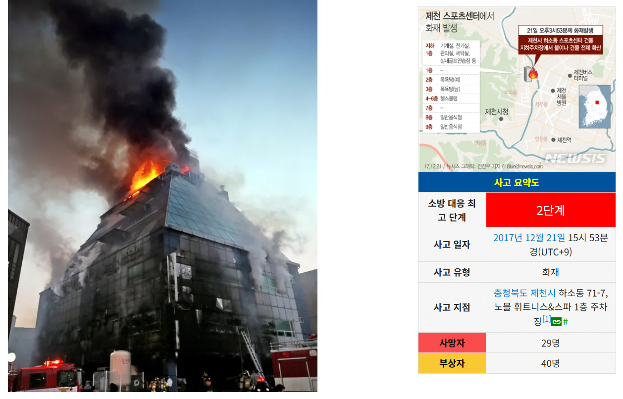 2017년 12/21일에 충북 제천 스포츠센터 건물에서 사상자 69명이 발생한 대형 화재 참사