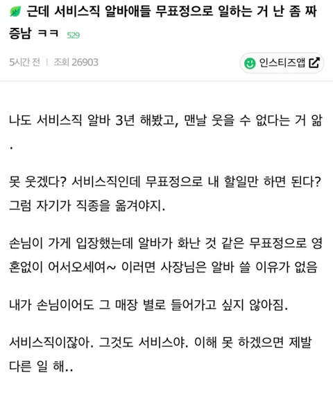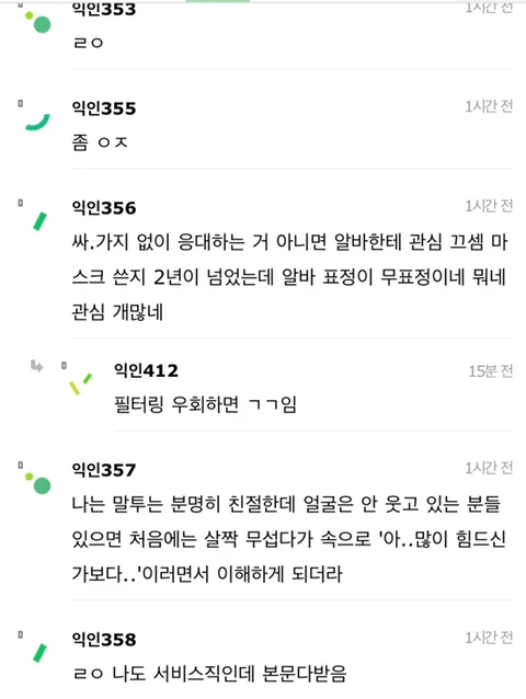 근데 서비스직 알바애들 무표정으로 일하는 거 난 좀 짜증남 댓글 0 조회 537 10.18 15:01 작성자 : 드가쥬아 좋아요 팔로우 게시글 보기 보통 욕안하고 계산만 잘해주는 점원이면 ok지. 나중에 발가락도 핥으라고 할 기세. 드가쥬아님의 최신 글 10.18 자영업5년차 느끼는 점 10.18 승무원들에게 무료로 개방되는 동네 헬스장 10.18 의외로 30넘어서도 은근 많다는 부류 10.18 Redmagic 11 Pro 공개, 세계 최초 수냉 스마트폰 10.18 올해의 드론사진 어워드 위너 작품 10.18 여자를 골라보라는 릴스에 댓글을 남긴 40대 남성 10.18 남친한테 거수경례 배우는 여자 10.18 펨코당 "캄보디아 송환청년은 사회의 희생자" 10.18 오늘 오픈한다는 메이플아지트 PC방 10.18 [주의] 충격적인 공중화장실 중국 여성 납치 장면