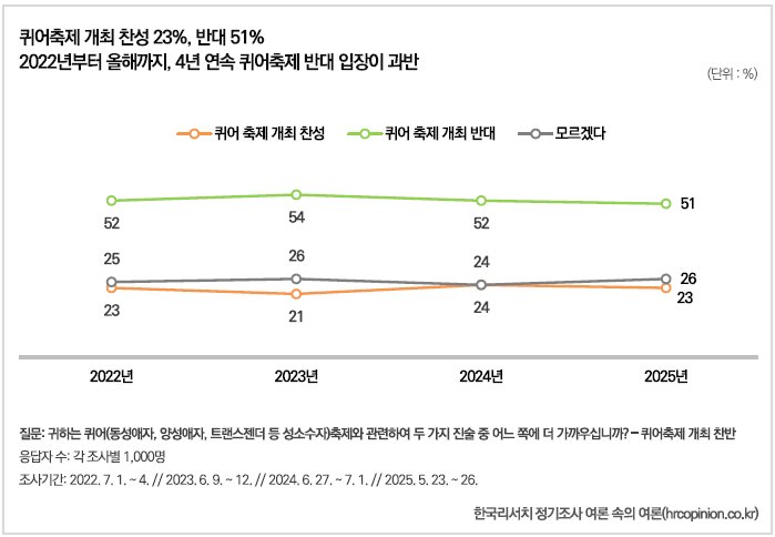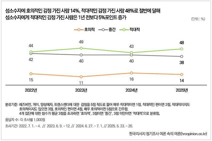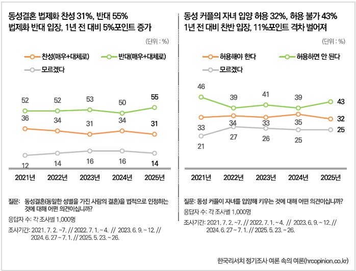 2025년 한국인들의 성소수자에 대한 인식 여론조사 댓글 0 조회 511 5시간전 작성자 : 갓파 좋아요 팔로우 게시글 보기 동성결혼 찬성 31%, 동성결혼 반대 55% 동성커플의 아동 입양 찬성 32%, 반대 43% 성소수자에게 호의적인 사람 14%, 적대적인 사람 48% 퀴어 축제 개최 찬성 23%, 개최 반대 51% 요약 한국인 10명 중 5명은 성소수자에게 적대적, 10명 중 1명은 성소수자에 호의적 한국인의 55%는 동성결혼 반대, 한국인의 31%는 동성결혼 찬성 60대 이상은 동성애에 매우 부정적, 그러나 트랜스젠더에게는 비교적 관대함 한국인 과반은 퀴어 축제 개최 반대 동성결혼 반대율 작년대비 5% 증가 갓파님의 최신 글 10.18 현직 공무원이 말하는 공공조직이 망해가는 근본적 이유 10.18 뽈쟁이 작가 사기당할뻔하는 만화 10.18 싱가포르서 나라 망신시킨 "한국인 모녀" 10.18 수양대군 실제 글씨체 ㄷㄷ 10.18 토네이도 형성 초기 장면 10.18 맛 없으면 바로 망하는 중국집 10.18 할로윈 복장을 하고 가정집에 살해 협박한 3인조 영상 10.18 친척동생이 두고 간 물건 10.18 미쳐버린 쿠팡 포장 레전드 10.18 디지몬 신작 게임 근황
