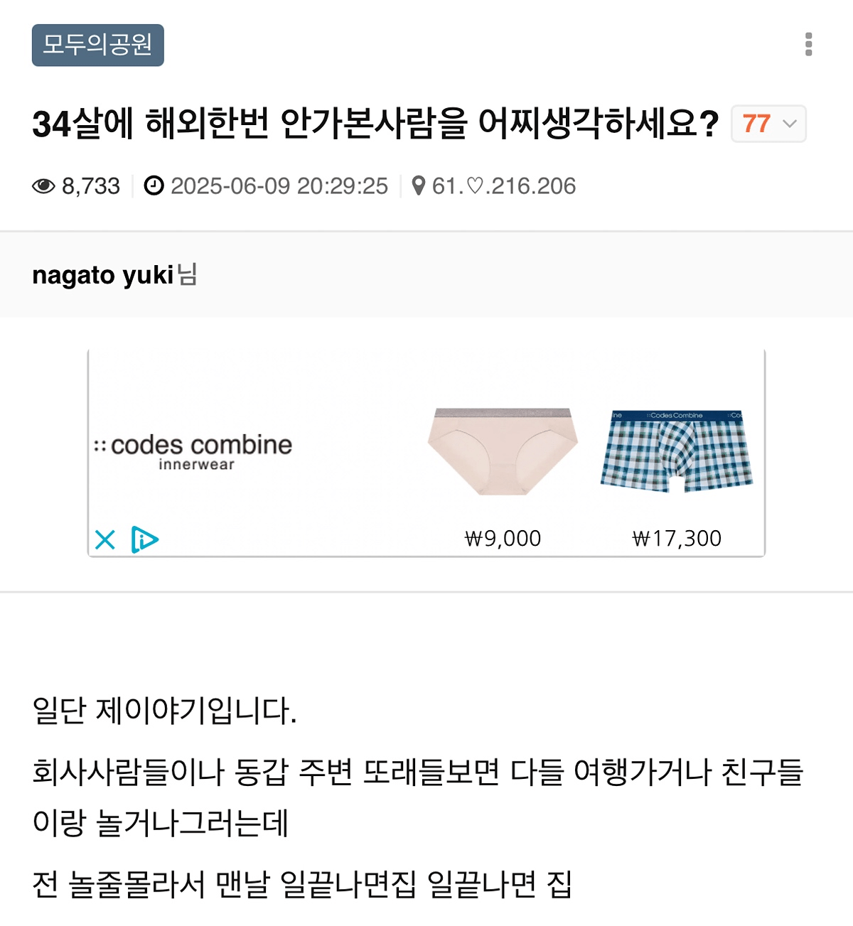 의외로 30넘어서도 은근 많다는 부류 댓글 0 조회 522 10.18 21:25 작성자 : 개장수11 좋아요 팔로우 게시글 보기 해외여행 한번도 안가본사람 개장수11님의 최신 글 10.19 권은비, 일본 공연 꼭노 영상 10.18 자영업5년차 느끼는 점 10.18 승무원들에게 무료로 개방되는 동네 헬스장 10.18 의외로 30넘어서도 은근 많다는 부류 10.18 Redmagic 11 Pro 공개, 세계 최초 수냉 스마트폰 10.18 올해의 드론사진 어워드 위너 작품 10.18 여자를 골라보라는 릴스에 댓글을 남긴 40대 남성 10.18 남친한테 거수경례 배우는 여자 10.18 펨코당 "캄보디아 송환청년은 사회의 희생자" 10.18 오늘 오픈한다는 메이플아지트 PC방