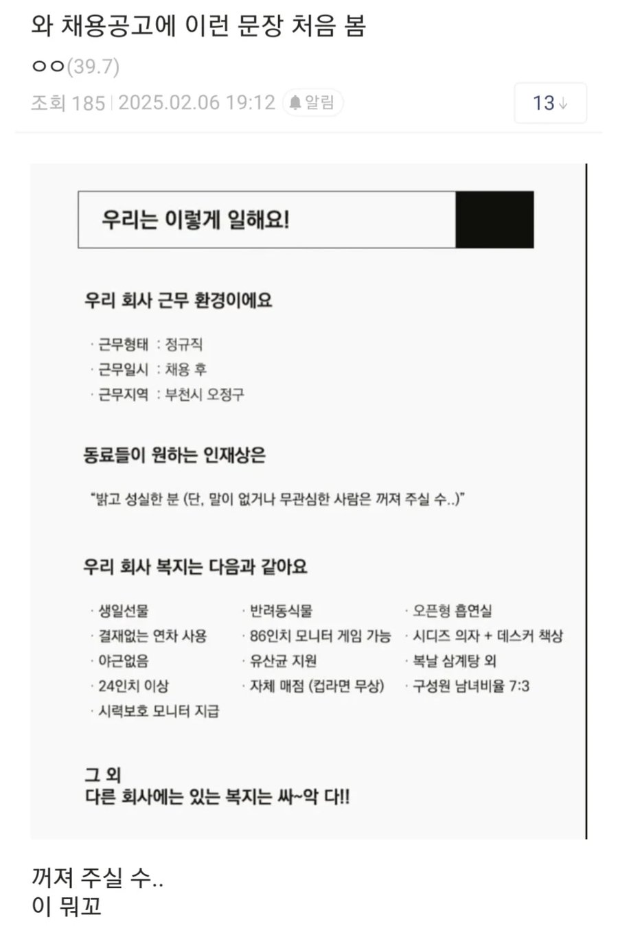 싱글벙글 요즘 채용공고 근황 댓글 0 조회 544 4시간전 작성자 : 드가쥬아 좋아요 팔로우 게시글 보기 드가쥬아님의 최신 글 10.19 대만-한국 이중국적자 남자의 슬픔 10.19 결정사 키의 중요성 ㄷㄷ 키작으면 400억도 힘들다 10.19 주요분야로 알아 보는 대학교 서열 10.19 한국인 필수 외래어 TOP 15 10.19 30대 남자들 진짜 너무 싫다.. 10.19 최근 에버랜드의 매우 수상한 근황 ㄷㄷㄷ 10.19 아이돌 데뷔 준비중이라는 존예 스시녀 10.19 아빠가 의사인 초딩 아들의 저속노화 저녁밥 10.19 CCTV에 찍힌 개주인의 애아빠 폭행 ㄷㄷㄷ 10.19 요즘 결혼시장에서 20대보다 30대 여자가 갑인 이유
