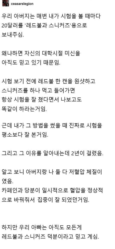 시험 볼때마다 레드불과 스니커즈 먹으라고 돈 보내는 아빠 댓글 0 조회 517 5시간전 작성자 : 드가쥬아 좋아요 팔로우 게시글 보기 드가쥬아님의 최신 글 10.19 개강 1주차에 강의평 공개한 교수님 10.19 세종대왕이 내린 무시무시한 형벌 10.19 요즘 다시 핫해진 과자들 10.19 일본 고등학교 졸업식 문화 민폐인지 논란 10.19 미국과의 관세협상 초비상인 이유 10.19 [속보] 합참 "북한군 1명 오늘 군사분계선 넘어 귀순" 10.19 농담곰 작가의 한국 음식 후기 10.19 아이폰 17 프로 변색 이슈 터짐 10.19 업비트 킬때 남자사진 끄는 방법 없나요? 10.19 인간보다 더 큰 기후변화를 일으켰던 생물