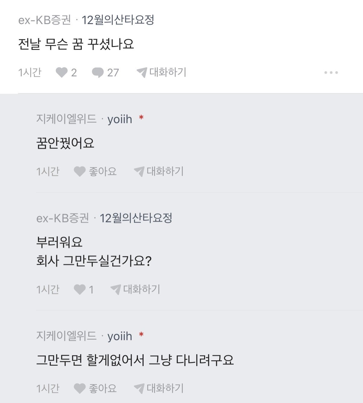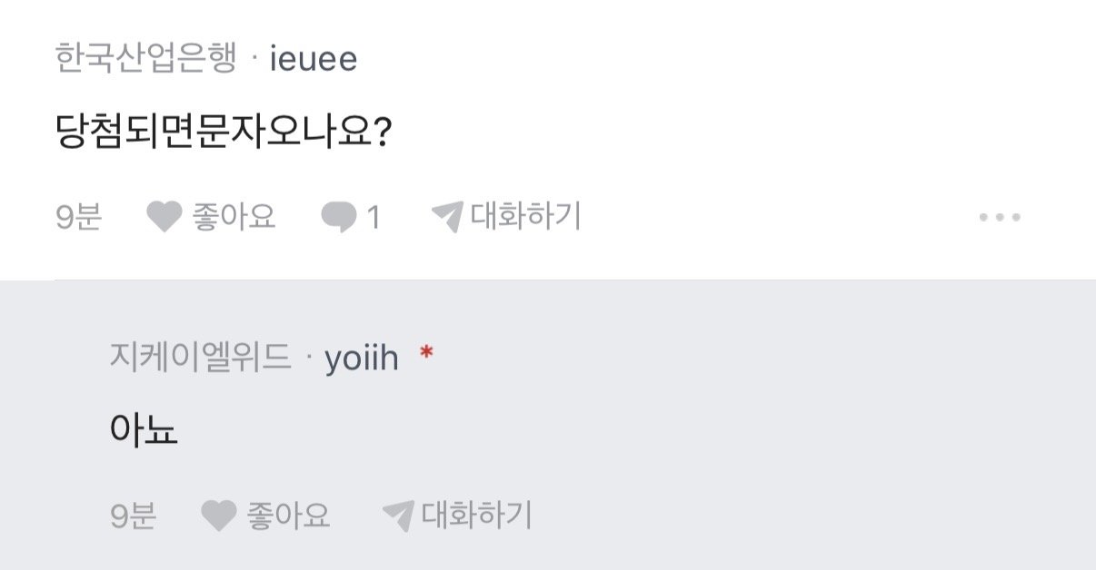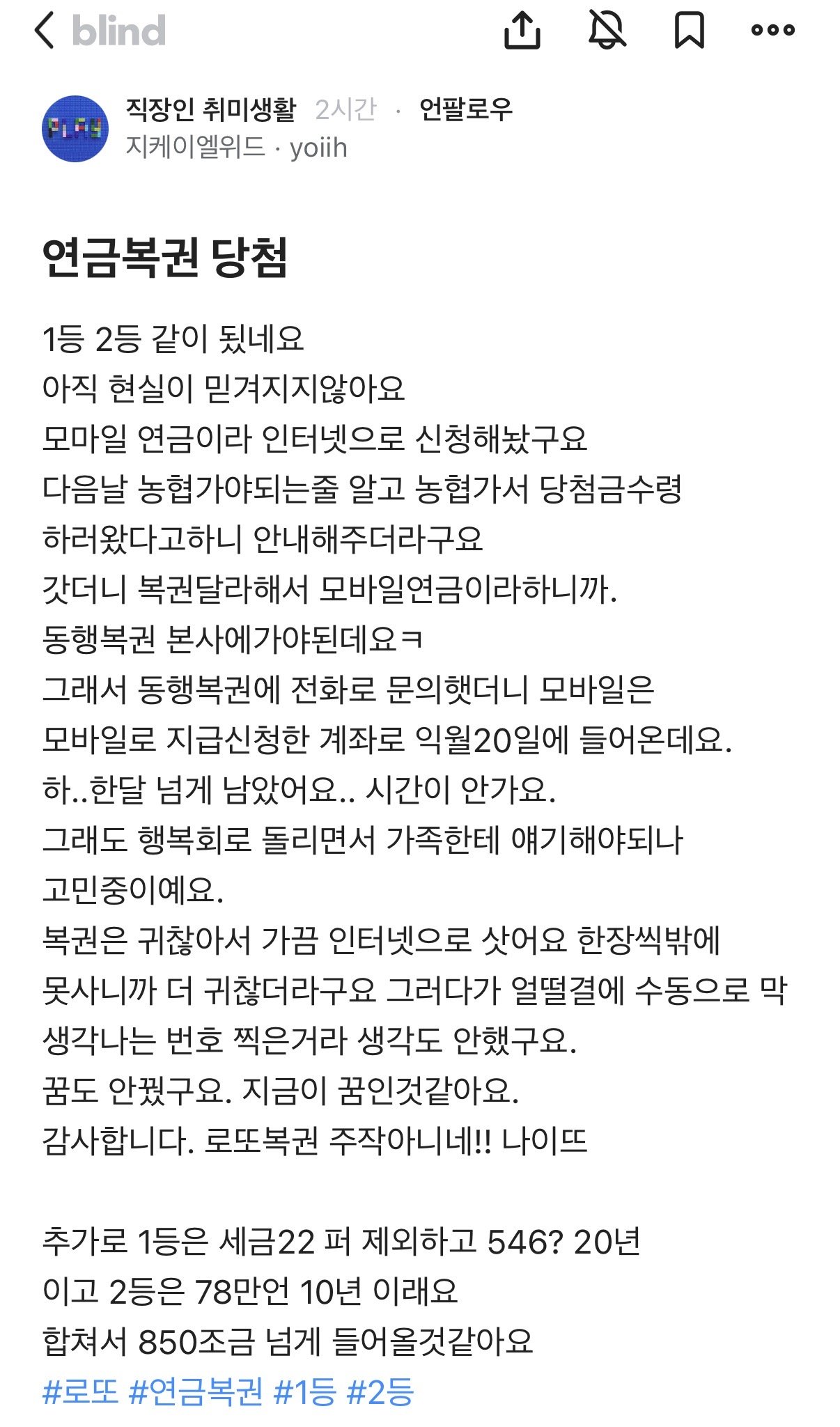 연금복권 1, 2등 인증한 블라인 댓글 0 조회 552 5시간전 작성자 : 대박노 좋아요 팔로우 게시글 보기 인터넷으로 사서 당첨되도 문자 안오네 대박노님의 최신 글 10.20 결혼 준비중인 여친이 장애동생 숨김 10.20 삶의 질을 높여주는 가전제품 TOP 3 10.20 새벽에 버거킹 먹고싶었던 오픈톡녀 10.20 문과만 일하고 이과는 노력하지 않는다는 증거 10.20 오들오들 여초회사 계시록 10.20 루브르 박물관 7분만에 보석털림 10.20 일본인들이 읽어보는 일본여자 특징 10.20 여기서 갖고싶은 조건 3가지만 고를수있다면? 10.20 하루 4시간씩만 일해도 1억받는다는 대기업직원 10.20 회가 나오는 12,000원 한식 뷔페