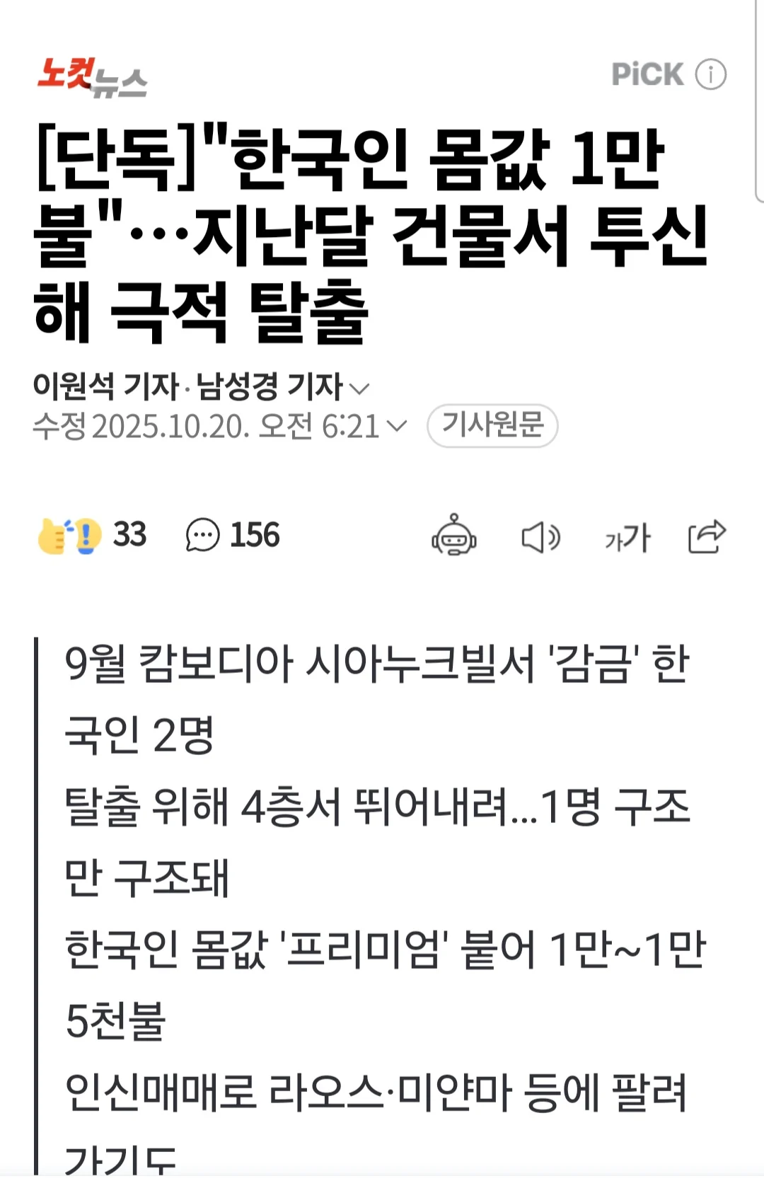 캄보디아서 탈출했다는 사람 댓글 0 조회 551 4시간전 작성자 : 돌잔치앤가반나 좋아요 팔로우 게시글 보기 https://n.news.naver.com/article/079/0004076652?cds=news_edit 돌잔치앤가반나님의 최신 글 10.20 (충격) 전세계국 아이폰 값 비교 10.20 ‘카톡 개편’ 주도 홍민택 카카오 CPO 사내 회의 잇단 불참 10.20 아이폰 에어, 플러스·미니 모델보다 많이 팔려 10.20 살 안 찌는 남자에게 1만 칼로리 먹여 보기 10.20 외교부 "캄보디아 대사관 업무시간외 방문해도 도울 것" 10.20 홈플러스 현재 상황 10.20 신입생과 4학년의 카톡 10.20 관우가 재물의 신이 맞나요? 10.20 씹덕한테 플러팅 당한 에타녀 10.20 30대 운동한 여자의 뒷태 변화