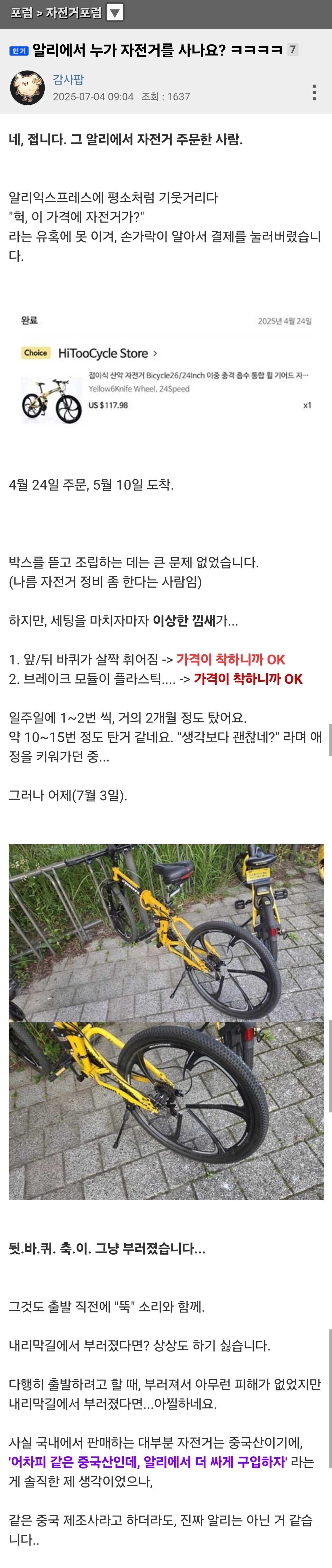 알리에서 자전거 산 뽐뿌인 대참사 댓글 0 조회 513 11시간전 작성자 : 가지마라 좋아요 팔로우 게시글 보기 가지마라님의 최신 글 10.21 수녀님한테 "씨발놈의 새끼"라는 소리 들었던 일 10.21 멕시코 사는 한국인이 느끼는 "한국의 불편함" 10.21 전기세 밀린 홈플러스 ㅎㄷㄷ 10.21 로스트아크 모바일 보X 검열 근황 10.21 여자들의 오X 품앗이.mp4 10.21 전직 대통령 재산 수집이 취미인 사람 10.21 스위스 시계업계의 ㄸ라이가 만든 시계 10.21 오늘밤은 안재운다는 여친 10.21 니네도 행복해라.blind 10.21 오랜 첫사랑을 끝낸 여학생