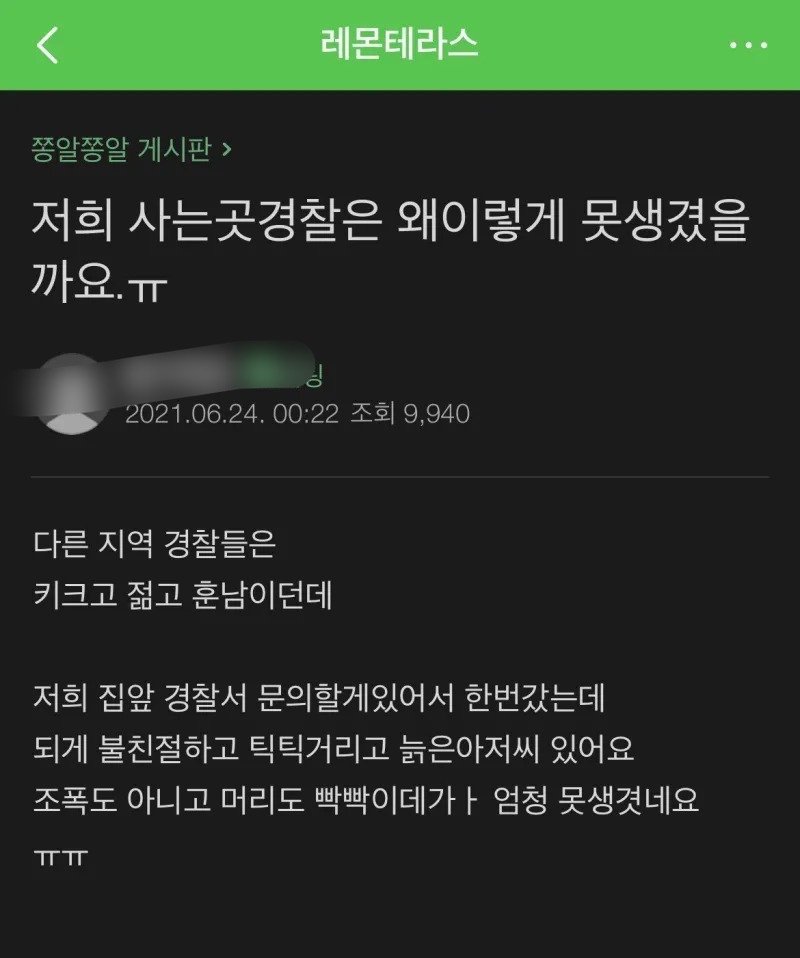 거주지역 경찰의 외모에 불만 있는 회원 댓글 0 조회 576 10.21 20:10 작성자 : 가비슈포댄서 좋아요 팔로우 게시글 보기 가비슈포댄서님의 최신 글 10.21 인스타에서 핫한 데드리프트 자세 10.21 어린시절 포켓몬스터를 했다면 모두가 공감하는 글 10.21 쪽팔려서 어쩔줄 모르는 일본 여중생 10.21 교수님이 햄스터였으면 좋겠다 10.21 화물차 H빔 드랍 + 안전거리 미확보 10.21 여자들이 설거지론에 거품무는 이유 10.21 약혐) 놀이기구 탔는데 누가 토함 10.21 1세대 AI의 위엄 ㅋㅋㅋ 10.21 구독자 839만 유튜버가 뽑은 인류 최고의 한 입 10.21 우리가 기억하는 피파 온라인2