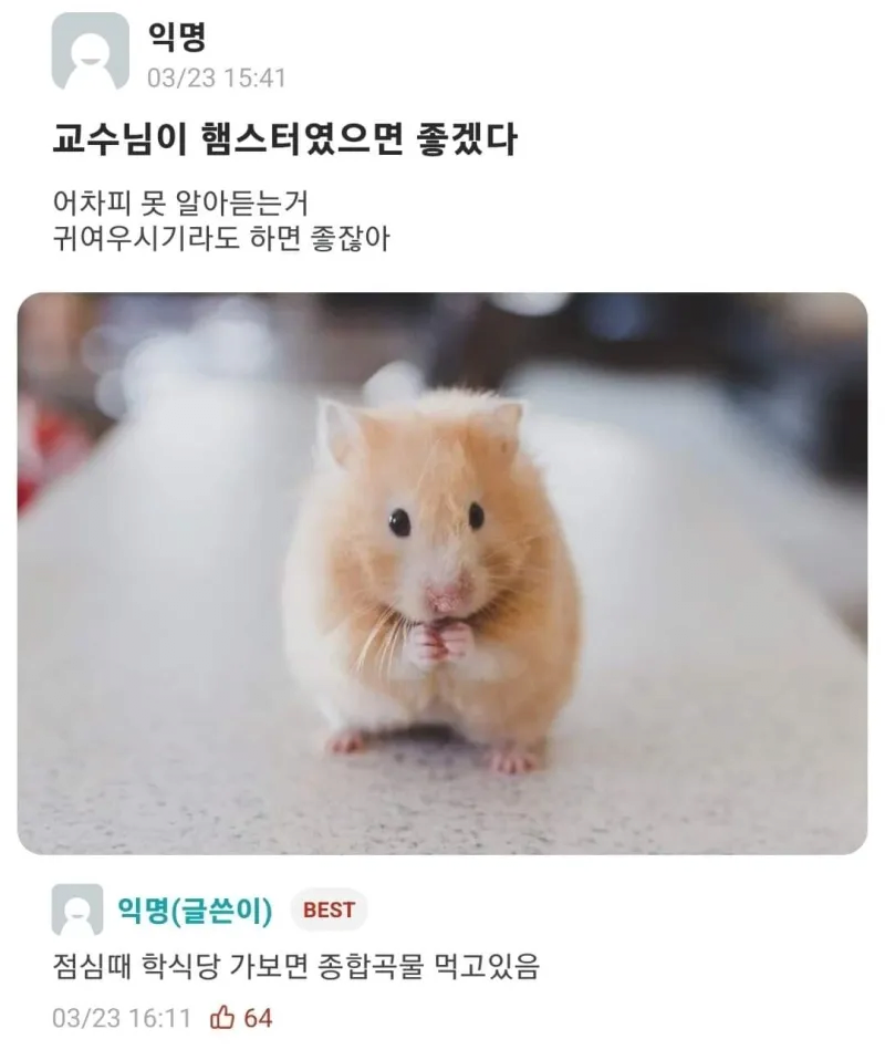 교수님이 햄스터였으면 좋겠다 댓글 0 조회 569 10.21 21:12 작성자 : 강승 좋아요 팔로우 게시글 보기 강승님의 최신 글 10.21 인스타에서 핫한 데드리프트 자세 10.21 어린시절 포켓몬스터를 했다면 모두가 공감하는 글 10.21 쪽팔려서 어쩔줄 모르는 일본 여중생 10.21 교수님이 햄스터였으면 좋겠다 10.21 화물차 H빔 드랍 + 안전거리 미확보 10.21 여자들이 설거지론에 거품무는 이유 10.21 약혐) 놀이기구 탔는데 누가 토함 10.21 1세대 AI의 위엄 ㅋㅋㅋ 10.21 구독자 839만 유튜버가 뽑은 인류 최고의 한 입 10.21 우리가 기억하는 피파 온라인2