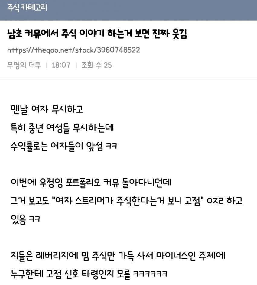 남초 커뮤에서 주식 이야기 하는 거 진짜 웃김 댓글 0 조회 558 10.22 14:08 작성자 : 개장수11 좋아요 팔로우 게시글 보기 그러하다 개장수11님의 최신 글 10.22 여자모임 술자리 더치페이 논란 10.22 앞차한테 하이빔 쏘고 클락션 오지게 누른 이유 10.22 지능 수준이 엄청나다는 보더콜리의 행동 10.22 10개 이상 못 찾으면 치매초기 10.22 일 안배우고 먼저 퇴근해버린 신입 간호사 10.22 한국전력 미쳐버린 근황 ㄷㄷ 10.23 건진법사, 김건희가 받은 그라프 목걸이·샤넬 가방 제출 10.22 카카오톡 기본 이모티콘 삭제되고 열화버전 들어옴 10.22 화제의 충북대 로스쿨 면접 후기 10.22 가격 인상한 땅스 부대찌개 충격 근황