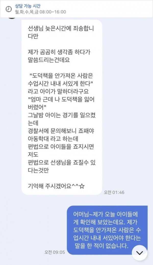 어느 초등학교 교사가 새벽에 학부모한테 받은 문자 댓글 0 조회 500 10.22 20:17 작성자 : 돌잔치앤가반나 좋아요 팔로우 게시글 보기 그럼 우리 애가 거짓말 했다는 건가요? 돌잔치앤가반나님의 최신 글 10.23 권은비, 일본 공연 꼭노 영상 10.22 여자모임 술자리 더치페이 논란 10.22 앞차한테 하이빔 쏘고 클락션 오지게 누른 이유 10.22 지능 수준이 엄청나다는 보더콜리의 행동 10.22 10개 이상 못 찾으면 치매초기 10.22 일 안배우고 먼저 퇴근해버린 신입 간호사 10.22 한국전력 미쳐버린 근황 ㄷㄷ 10.23 건진법사, 김건희가 받은 그라프 목걸이·샤넬 가방 제출 10.22 카카오톡 기본 이모티콘 삭제되고 열화버전 들어옴 10.22 화제의 충북대 로스쿨 면접 후기