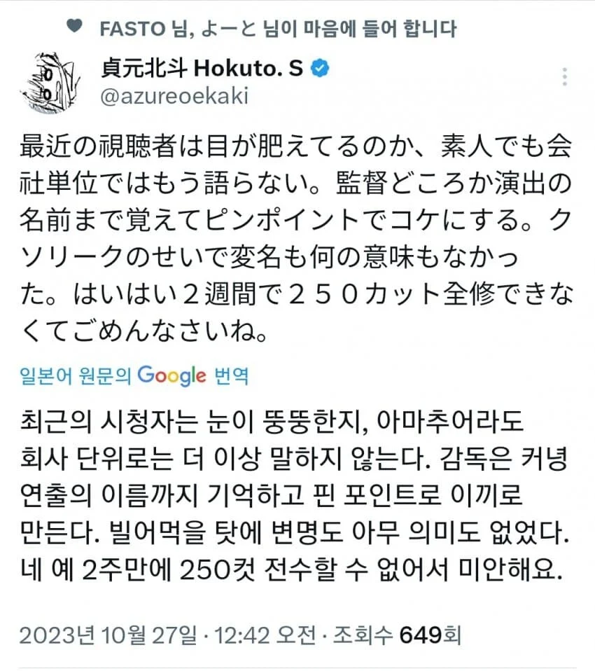 요즘 애니메이션 업계에서 나름 심각해진 경향 댓글 0 조회 597 7시간전 작성자 : 공룡 좋아요 팔로우 게시글 보기 전에는 애니가 구리면 애니 회사 욕하고 말았는데 이제 작감, 원화가 목록 뜯어다가 어떤어떤 컷 작업했는지 따져보고 맘에 안 들면 개인 SNS로 찾아가서 책임 따지면서 비난하는 사람이 엄청 많아짐 일도 빡센데 비난까지 쏟아지니까 멘탈 터지는 애니메이터 다수 공룡님의 최신 글 10.23 남편이랑 이혼한다 vs 봐준다 10.23 부모님 생활습관이 마음에 안들면 어떻게 하냐 10.23 히키코모리 박사학위 소지자 10.23 남자몸무게 60kg vs 90kg 10.23 김천 김밥축제의 최종 감다살 10.23 야간에 차 사고내는 사람 특징 10.23 퇴역 군인한테 안락사를 권유한 캐나다 보훈처 10.23 가벼운 테스트로 알아보는 내 등근육 나이 10.23 싱글벙글 남자들 요리할 때 특징 10.23 성형수술에 도전해볼만한 이유