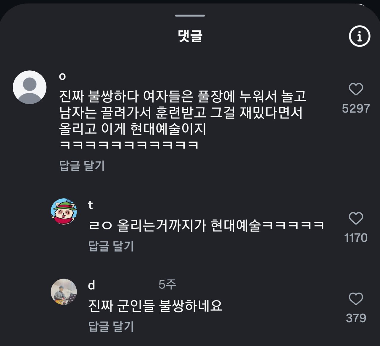 구도 폭력적인 현대 예술 댓글 0 조회 514 6시간전 작성자 : 가비슈포댄서 좋아요 팔로우 게시글 보기 가비슈포댄서님의 최신 글 10.23 남편이랑 이혼한다 vs 봐준다 10.23 부모님 생활습관이 마음에 안들면 어떻게 하냐 10.23 히키코모리 박사학위 소지자 10.23 남자몸무게 60kg vs 90kg 10.23 김천 김밥축제의 최종 감다살 10.23 야간에 차 사고내는 사람 특징 10.23 퇴역 군인한테 안락사를 권유한 캐나다 보훈처 10.23 가벼운 테스트로 알아보는 내 등근육 나이 10.23 싱글벙글 남자들 요리할 때 특징 10.23 성형수술에 도전해볼만한 이유