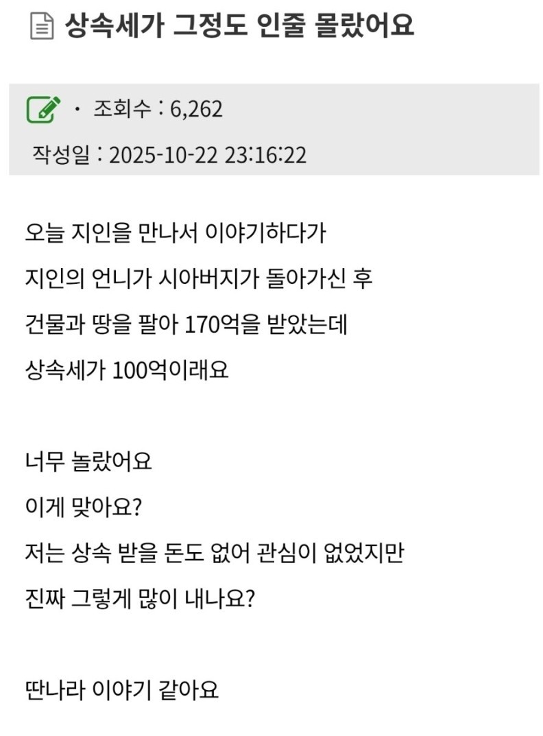 상속세가 이정도인지는 몰랐네요 댓글 0 조회 564 5시간전 작성자 : 드가쥬아 좋아요 팔로우 게시글 보기 드가쥬아님의 최신 글 10.23 "명성황후 침실" 문 열라 했다…尹전 대통령 부부, 곤녕합 단둘이 10분 10.23 교촌 치킨 결국 항복 선언 10.23 유모차 애엄마 뺑소니 치고 달아나는걸 목격한 시민 10.23 초등학생의 부업 10.23 일론 머스크 "한국 삼겹살 정말 맛있어" 10.23 진짜 바쁜 직장인 특징 ㄹㅇ 10.23 이따구로 생긴 뚜껑 열 때마다 하는 행동 10.23 최근 새로운 인물사진 공개됐다는 한국 위인 10.23 제주 올레시장 오징어 바가지 반전 10.23 인류가 발견한 가장 거대한 항성