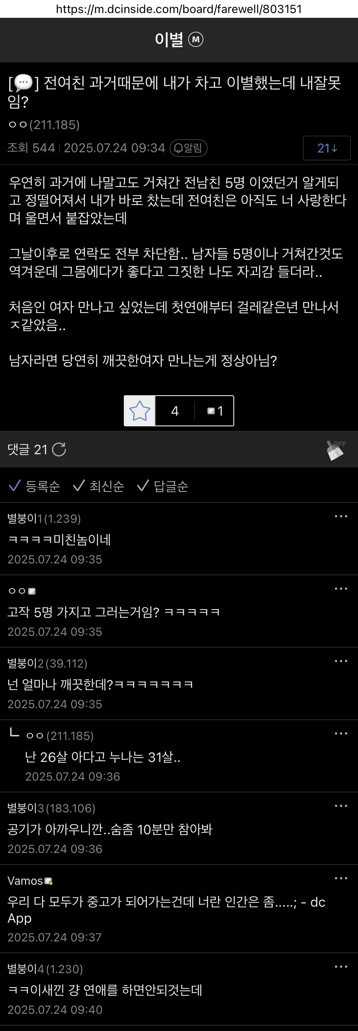 31살 여친이 성경험으로 거쳐간 남자만 5명 댓글 0 조회 538 3시간전 작성자 : 가자가자가자고 좋아요 팔로우 게시글 보기 댓글보니 글쓴이는 26살 남자인것 같은데 여자나이 31살에 5명이면 많은건가? ㄷㄷ... 여친쪽은 거의 누나뻘 인데 남자가 너무 어려서 저러나? 요즘 연상연하 커플 많은듯 가자가자가자고님의 최신 글 10.23 "명성황후 침실" 문 열라 했다…尹전 대통령 부부, 곤녕합 단둘이 10분 10.23 교촌 치킨 결국 항복 선언 10.23 유모차 애엄마 뺑소니 치고 달아나는걸 목격한 시민 10.23 초등학생의 부업 10.23 일론 머스크 "한국 삼겹살 정말 맛있어" 10.23 진짜 바쁜 직장인 특징 ㄹㅇ 10.23 이따구로 생긴 뚜껑 열 때마다 하는 행동 10.23 최근 새로운 인물사진 공개됐다는 한국 위인 10.23 제주 올레시장 오징어 바가지 반전 10.23 인류가 발견한 가장 거대한 항성