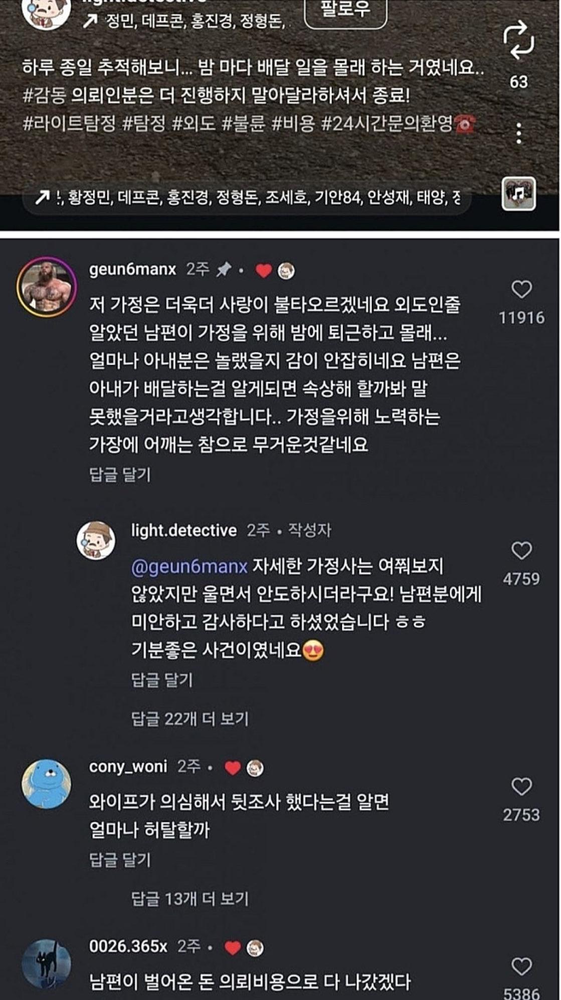 남편의 외도 의심을 의뢰 받은 탐정 댓글 0 조회 596 10.23 22:01 작성자 : 더한마음 좋아요 팔로우 게시글 보기 더한마음님의 최신 글 10.23 대한민국 날씨 근황 10.23 의외로 현실에서 가능하다는 자세 10.24 권은비, 일본 공연 꼭노 영상 10.23 연세대 강의실 콘돔 ㄷㄷ 10.23 엘리자베스 2세 여왕 방한 당시 두 기업의 신경전 10.23 잘 몰랐던 식품 소비기한 10.23 배달하다 향냄새를 맡은 배달 라이더 10.23 수면바지 입는 알바에게 문자보낸 점장님 10.23 열심히 살고 있다는 흙수저 10.23 여자친구가 라식 수술함