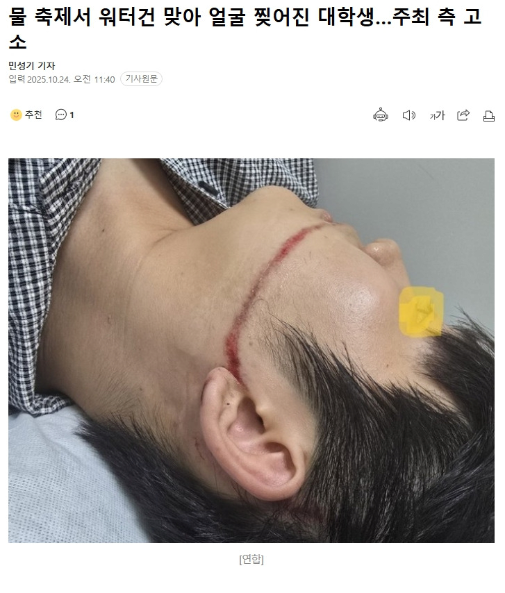 물 축제서 워터건 맞아 얼굴 찢어진 대학생