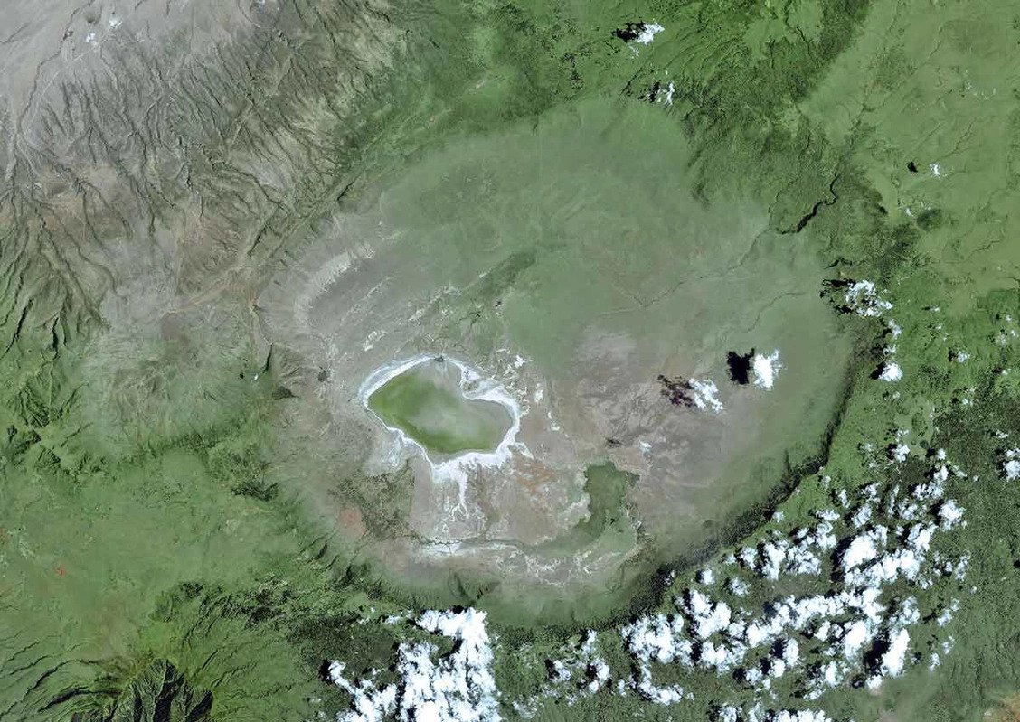 위성 영상 공사를 통해 우주에서 본 응고롱고로 분화구(또는 칼데라)의 엄청난 크기