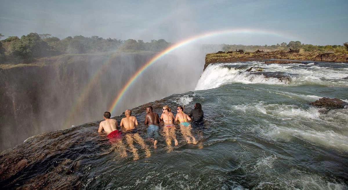 잠베지 강이 떨어지며, 형성된 빅토리아 폭포는 아프리카를 대표하는 장대한 폭포다. 토착 언어로 ‘우레와 같은 연기’를 뜻하는 이름을 가진 이 폭포는 매년 약 1천만㎥의 물이 초당 쏟아져 내리며, 천둥 같은 물보라를 일으킨다. 모험가들은 폭포 끝에 위치한 ‘데빌스 풀’에서 아찔한 수영을 즐기기도 한다.