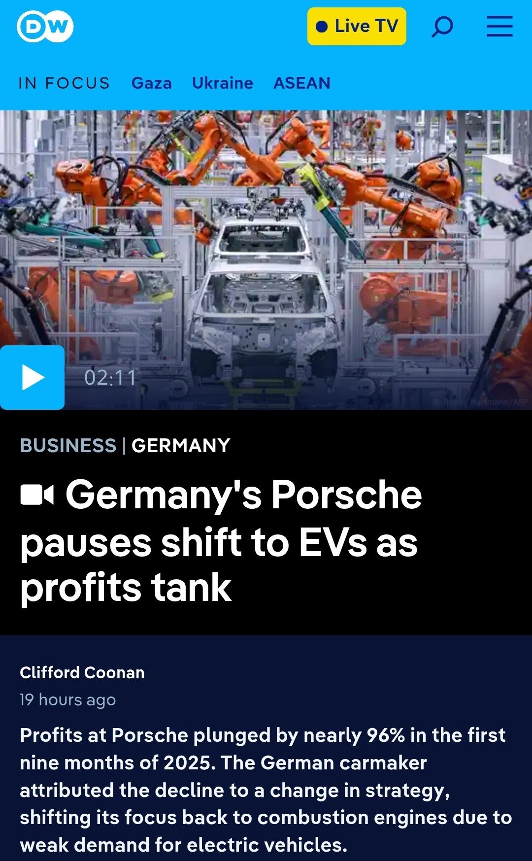 2025년 1월~9월 동안의 이익이 전년대비 96% 감소 했다는 포르쉐