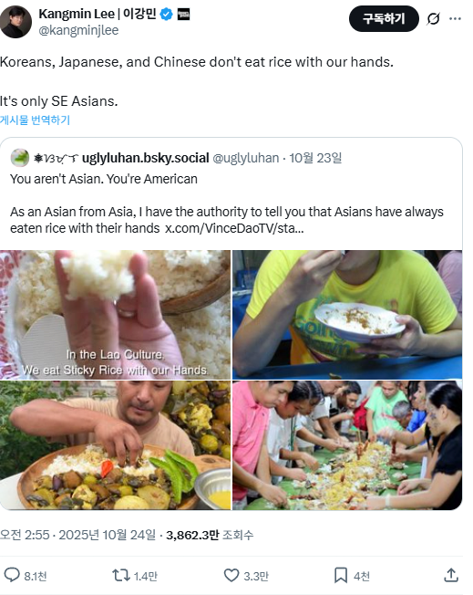 밥을 손으로 먹은 사진 때문에 아시안끼리 붙은 인종차별