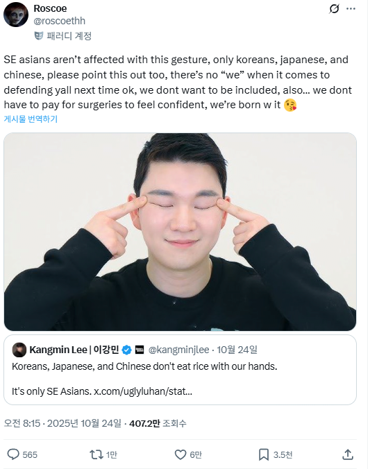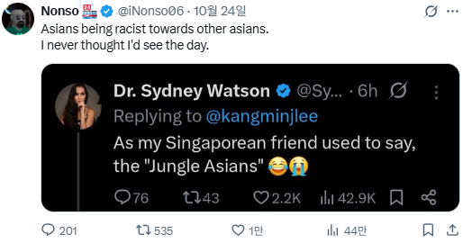 "동양인들끼리 인종차별이라니 ㅋㅋㅋ 이런 날이 올줄이야"
