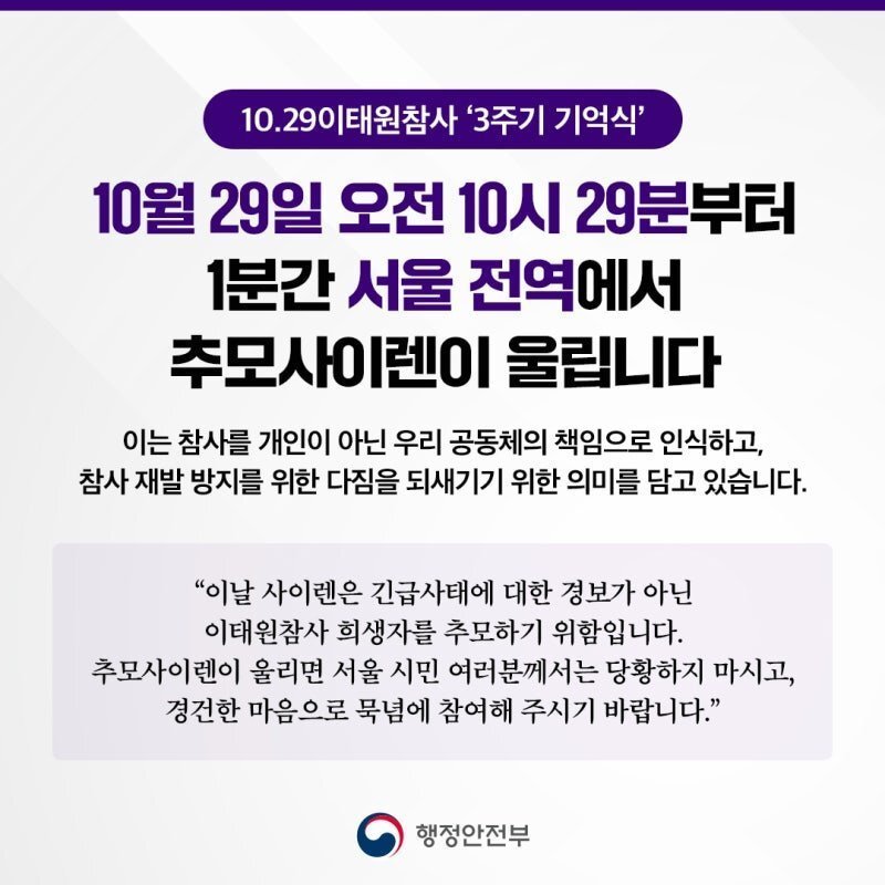내일 서울전역 이태원 추모 사이렌 울릴 예정이래