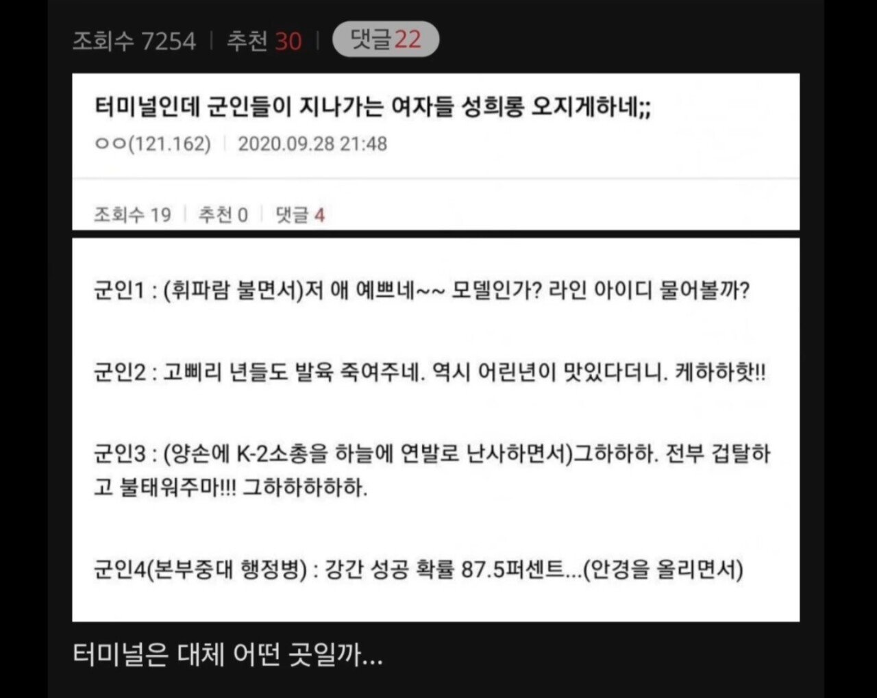 터미널에서 지나가는 여자들 성희롱하는 요즘 군인들