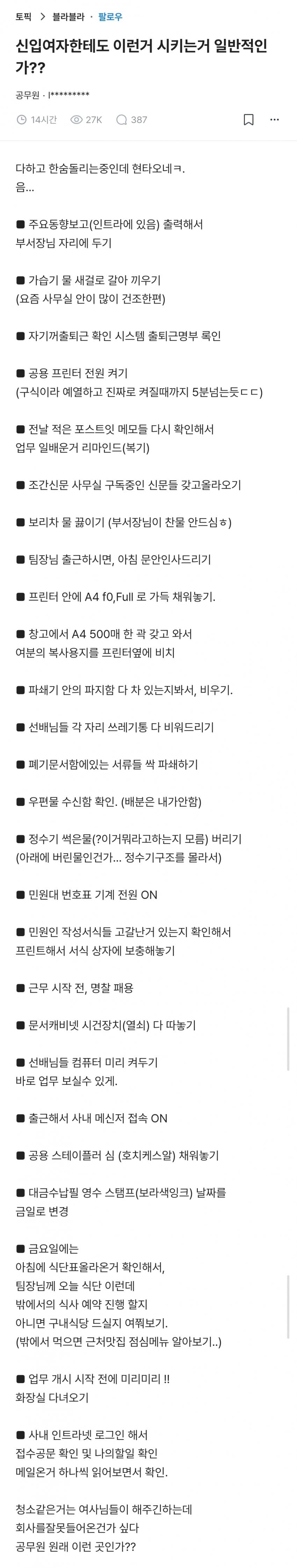 신입여자한테도 이런 거 시키는 거 일반적이야?