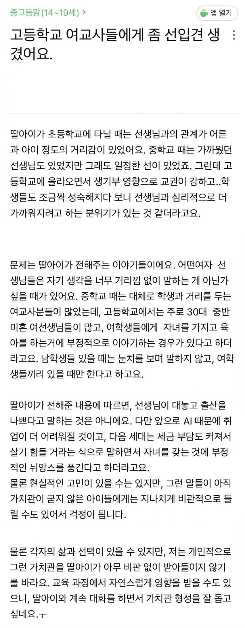 여교사들에게 선입견 생겼다는 맘카페 학부모