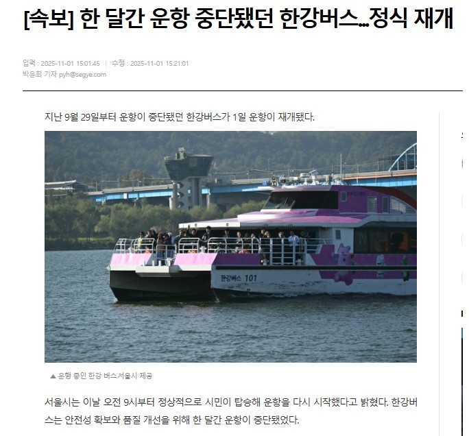 한 달간 운항 중단됐던 한강버스...정식 재개