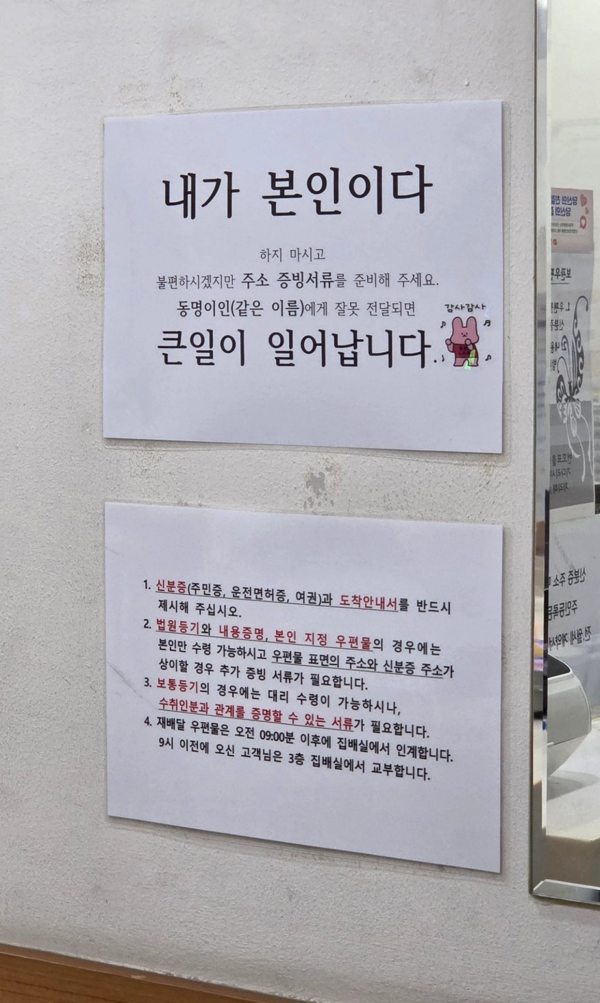 우체국 등기 받으러 갔는데 벽에 붙어있는거