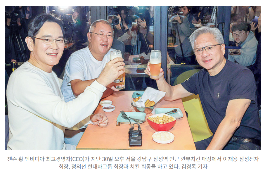 서울 강남구 삼성동 깐부치킨 매장을 콕 집은 것도 매디슨 황이었다고 한다. 익명을 원한 여권 관계자는 “메디슨 황이 친한 친구라는 의미의 은어인 깐부를 직접 타기팅해 장소를 고르고 ‘인공지능(AI) 깐부’ 결성이란 컨셉에서 그날 행사를 기획한 것”이라고 전했다. 메디슨 황은 한 달 전 먼저 방한해 엔비디아와 협력 관계인 관련 기업들을 방문할 때 이 매장을 치맥회동 장소로 선정했다고 한다.
