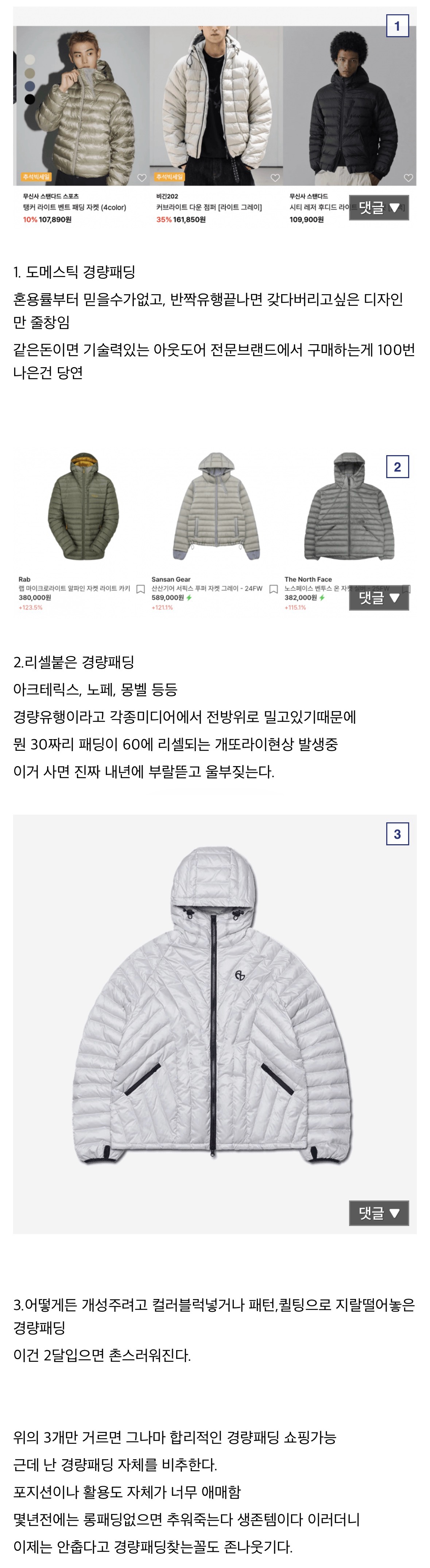 구매를 뜯어 말리는 경량패딩 종류..